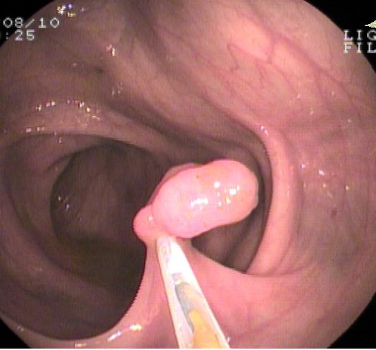 ⒉经肛门切除息肉 距肛门8厘米以下的直肠息肉,可用扩肛器扩开肛门,钳子夹住息肉,在息肉蒂部用丝线结扎,切除息肉。广基的息肉切除后,黏膜的创面要予以缝合。