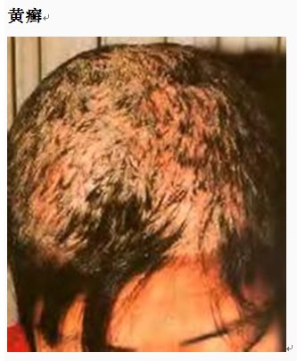 本病发生于头皮部,起初皮损为丘疹或脓疱,以后干燥结痂,颜色淡黄。痂可蔓延扩大,大小如黄豆或更大。此时该痂外观与碟形相似,周边稍稍隆起,中央略呈凹陷,其间有毛发贯穿,此则所谓黄癣痂,系由黄癣菌集团、皮脂、鳞屑以及尘埃等组成。乃黄癣之重要特征,对诊断有帮助。同时也提示该病此时具有较强传染性,往往需要隔离治疗。该痂质如豆渣,容易粉碎,嗅之有鼠臭味,这也是本病另一特点。相邻的痂,可互为融合,形成大片灰黄色厚痂,若刮去结痂,其下可呈潮红湿润面或浅在性溃疡,如不医治可破坏毛囊,愈后遗留萎缩性痕疤。