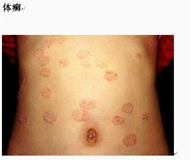 体癣多见于儿童其次是青少年。本病临床表现与致病真菌种类及个体反应有关。皮疹始为红斑或丘疹、随后损害渐渐呈远心性向四周扩展,病灶中央有自愈倾向,日久成为环形。环的边缘稍为比邻近正常皮肤高起,该处炎症状较明显、其上有小丘疹、水疱或鳞屑附着。有时,环形中央又