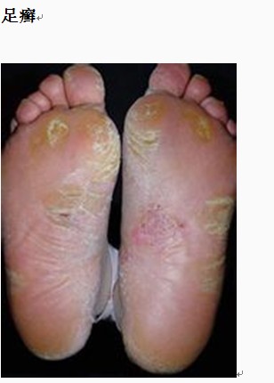 (三)鳞屑角化型:颇为常见,好侵犯足底,足侧、趾间及足跟部。皮损表现为鳞屑,角质增厚,粗糙变硬,间有皲裂,每至冬季病性尤重。