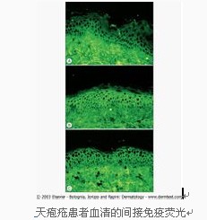 证明IgG(或IgA天疱疮中的IgA)抗体直接作用于角质形成细胞表面,是诊断天疱疮的金标准。通过对这些抗体的检测,来区分天疱疮和其它水疱大疱性或脓疱性疾病。证明天疱疮自身抗体的方法包括直接IF、间接IF、免疫沉淀、免疫印迹和酶联免疫吸附试验(enzyme-linked immunosorbent assay ,ELISA)。