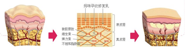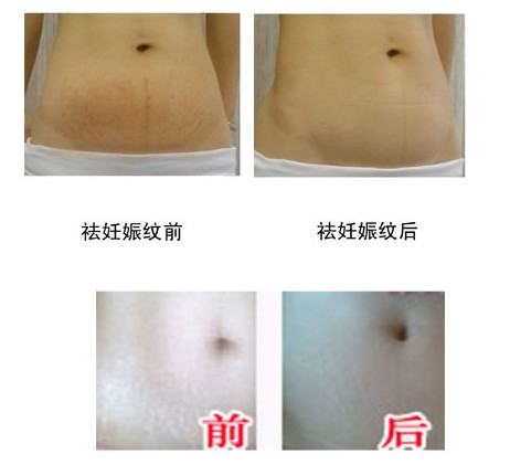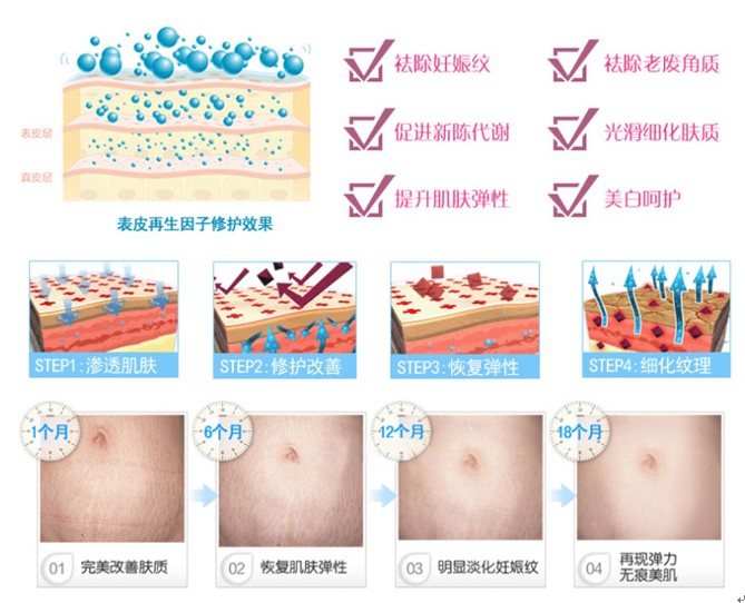 由妊娠纹产生的原因可知,要想♀消除妊娠纹,较关键的就是—“修复腹壁皮肤的弹力纤维和胶原纤维,使其恢复正常”,而去妊娠纹产品是做不到这一点的,因为产品仅能作用于皮肤表层,无法渗透至真皮层,也无法使损伤或断裂的弹力和胶原纤维恢复正常。
