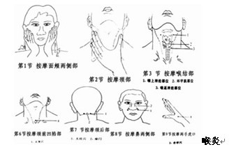 第2节,按摩颈部:此节重点,对颈部肌肉,主要对两侧颈部的胸锁乳突肌、颏舌骨肌进行按摩。有人在唱歌前和唱歌中,这部分肌肉紧张,产生头向前伸出的现象。作法:将一手掌(左手.或右手)放在颈前,拇指与示指分开,手的虎口对准喉结,拇指按住一侧颈肌,其它4指按住另一侧颈肌,手指轻轻捏动20下。再作小旋转式按摩20下。然后换手,按前法再作一遍。