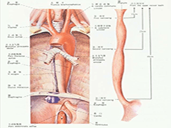 8.食管穿孔:晚期食管癌,尤其是溃疡型食管癌,因肿瘤局部侵蚀和严重溃烂而引起穿孔。因穿孔部位和邻近器官不同而出现不同的症状。穿通气管引起食管气管瘘,出现进饮食时呛咳解剖学,尤其在进流质饮食时症状明显;穿入纵膈可引起纵膈炎,发生胸闷、胸痛、咳嗽、发热、心率加快和白细胞升高等;穿入肺引起肺脓疡,出现高热、咳嗽、咯脓痰等;穿通主动脉,引起食管主动脉瘘,可引起大出血而导致死亡。
