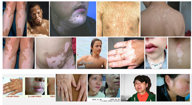检查:伍德灯检查,嘴角白斑有荧光反应,边缘模糊;微量元素:0.48mg/l;微循环检测:轻度异常;黑色素细胞抗体:4-320ngml(参考值);酪氨酸酶抗体:1.5-120ngml(参考值)