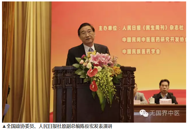 人民日报社原副总编陈俊宏在对中医药的弘扬、宣传方面提出中医是我们中华民族的瑰宝,是我们的优势,而且是伴随着我们民族一直延续下来,所以中医的传承发扬光大,发挥优势,在今天显得特别的重要。人民日报社以及各主流媒体对发展中医的优势,振奋中医,在宣传上负有艰巨的责任,